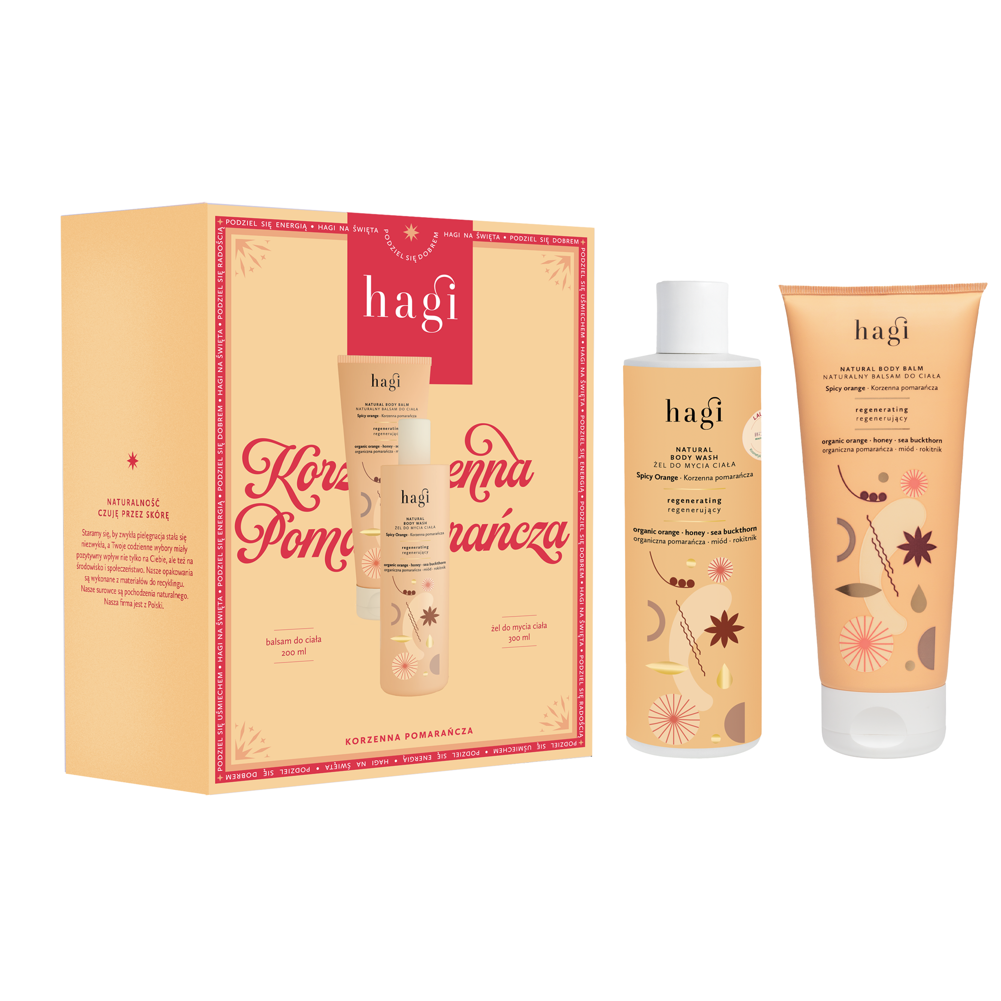 Cudownie pachnący zestaw do pielęgnacji ciała z serii Korzenna Pomarańcza Hagi. Energetyzujący żel łagodnie oczyszcza i dba o nawilżenie już na etapie mycia. Pomarańczowy balsam do ciała natychmiast regeneruje i dogłębnie nawilża, a jego obłędny zapach zostanie z Tobą na dłużej. Ten niesamowity duet otuli Cię intrygującym, rozgrzewającym zapachem pomarańczy oraz aromatów goździków oraz cynamonu, które doskonale wpisują się w zimową, zwłaszcza świąteczną aurę. Poczujesz, że Twoja skóra jest zadbana, pachnąca i odżywiona.